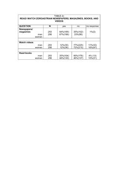In terms of reading and watching Zoroastrian literature and videos, it was found that Zoroastrian newspapers and magazines were the most popular; 65% read a Zoroastrian newspaper or magazine, with 39% reading Zoroastrian books. The latter includes books written by Zoroastrians or about Zoroastrianism. Twelve percent said that they watched Zoroastrian videos. There were numerous comments on the questionnaires about the availability of videos dealing with Zoroastrianism. These respondents were interested in watching such videos but did not know where to find them.
