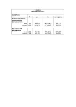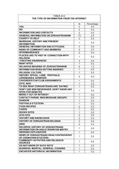 The internet was used by twenty five percent of the respondents to gain information about Zoroastrianism, with 66% of the respondents saying ‘no’. Few of the respondents, 4%, used the internet to discuss Zoroastrianism see Table 2d 2: ‘The type of information from the Internet’. The internet was used by a quarter of the respondents: it is not known how many respondents had access to the internet and did not use it.