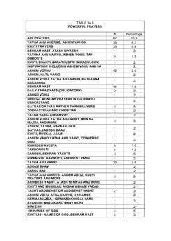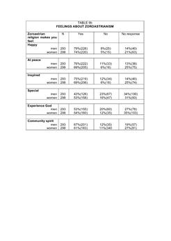 9. The new questions in the 2003 questionnaire schedule: the power of prayer; feelings about the Zoroastrian religion and community; Zoroastrian values compared with European values; Zoroastrian purity laws