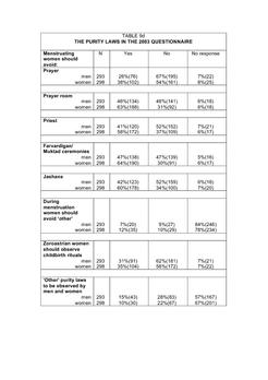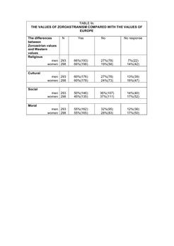 New questions were asked in the 2003 questionnaire because of questions arising from a statistical analysis of the data relating to the symbolic boundaries of Zoroastrianism from the 1985 survey. The new questions concerned with the purity laws, feelings about Zoroastrianism and Zoroastrian values compared with European values. Also, a new question was added about the power of prayer, because in the previous two surveys only the question ‘Do you pray’ had been asked and it was considered to be important to know what the respondents felt about prayer and what prayers they used.