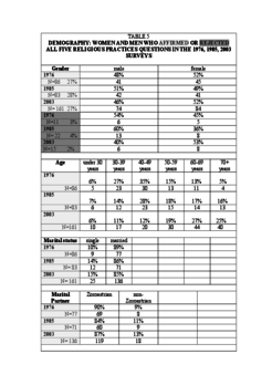 However, seven of the respondents from the 2003 survey affirmed all of the eight religious beliefs questions and five of the respondents rejected all of them. In the 1976 survey 250 people, 80% of the total group of respondents affirmed at least one of the eight religious beliefs questions and 279 people, 89% of the total group rejected at least one of the eight of them whereas in the 1985 survey 455 people, 91% of the total group of respondents affirmed at least one of the eight religious beliefs questions and 454 people, 91% rejected at least one of them. In 2003 survey, 577 people, 96% of the total group of respondents, affirmed at least one of the eight religious beliefs questions and 433 people, 72% of the total group of respondents, rejected at least one of them. There has been an increase from the 1976 survey to the 2003 survey in percentage terms of respondents who affirm at least one religious belief question and a decline in percentage terms in respondents who reject at least one. In the 2003 survey women affirmed the religious beliefs questions at a slightly higher rate, 50%, (9) women, than the men, 48% and similarly the men rejected, 51%, (13) men, at a slightly higher rate than the women, 48%. The differences are so small that the affirmation and rejection rate is roughly equal for both women and men. Similarly in the 1985 the men and the women were roughly equal in their affirmation or rejection of one of the eight religious beliefs questions. In the 1976 survey more men, in percentage terms, both affirmed and rejected at least one of the eight religious beliefs questions than did the women: 54%, (135), and 55%, (153) men affirmed and rejected at least one of the eight religious beliefs questions whereas 46%, (114), and 45%, (125) women affirmed and rejected at least one of them in the 1976 survey. In all other respects the differences between the demographic characteristics of the respondents, in the 1976, 1985 and 2003 surveys that affirm or reject at least one of the eight religious beliefs is minimal. The details are recorded in table 7 below.