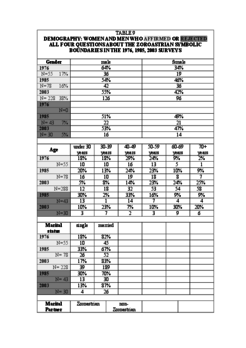 There were no respondents in the 1976 survey who rejected all four questions listed in table 8, ‘Zoroastrian Symbolic Boundaries questions’, about the symbolic boundaries of Zoroastrianism, whereas in the 1985 and 2003 surveys 7%, (43), and 5%, (30), of the respondents rejected all the symbolic boundaries’ questions. Fifty five people, 17%, in the 1976 survey, affirmed all four symbolic boundaries questions, 78 people, 16%, did so in the 1985 survey and 288 people, 38% did so in survey of 2003. There was a low ‘no response’ rate for the questions relating to the symbolic boundaries in the 1976 survey. Thus, the fact that none of the respondents rejected all the questions relating to the symbolic boundaries is not associated with a low response rate. More men than women affirm all four questions relating to the symbolic boundaries. In the case of the respondents who reject all four questions relating to the symbolic boundaries, there is a virtually no percentage difference between the men and the women in the 1985 and 2003 surveys.